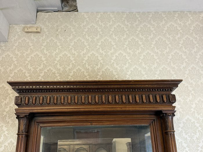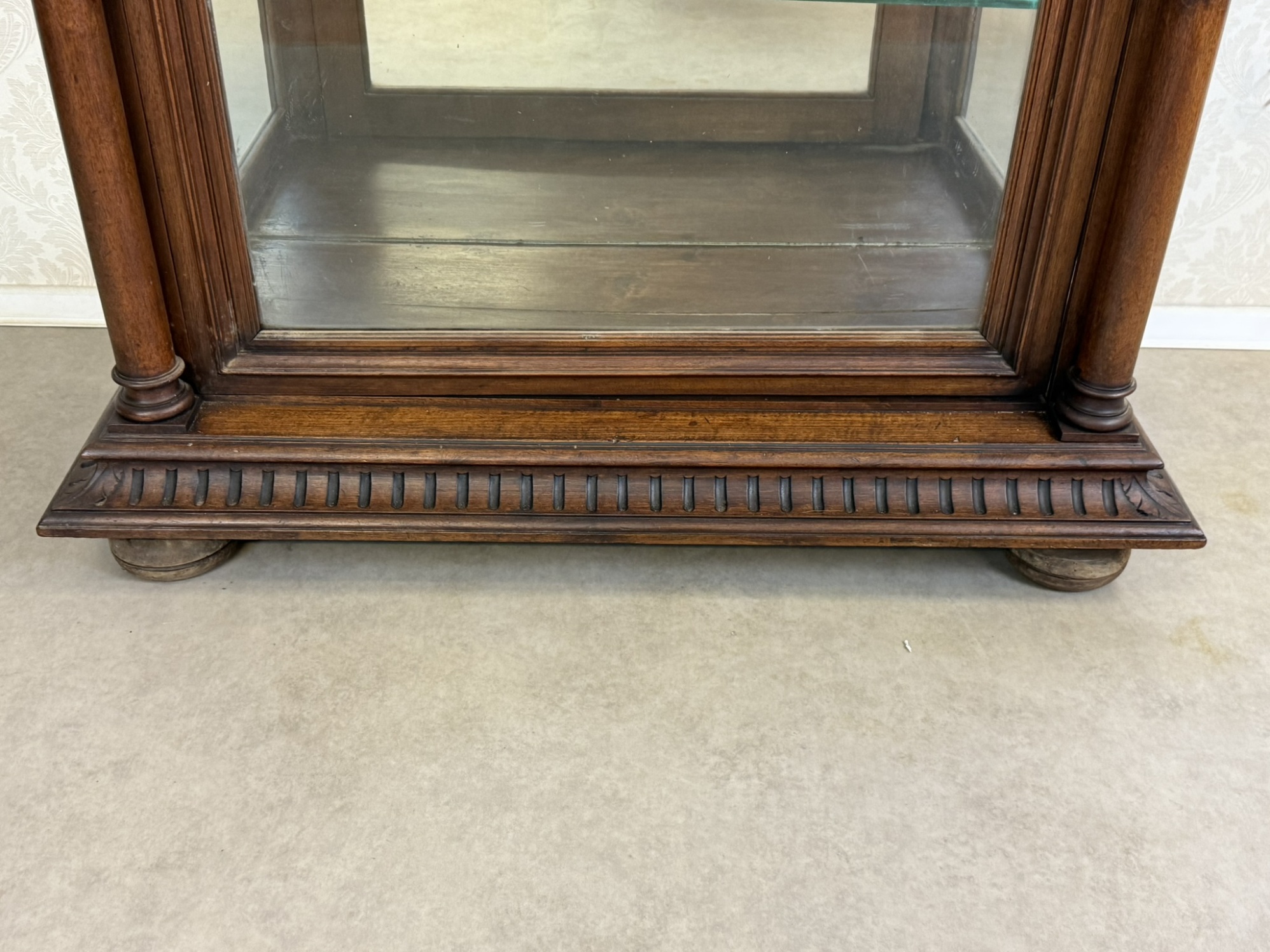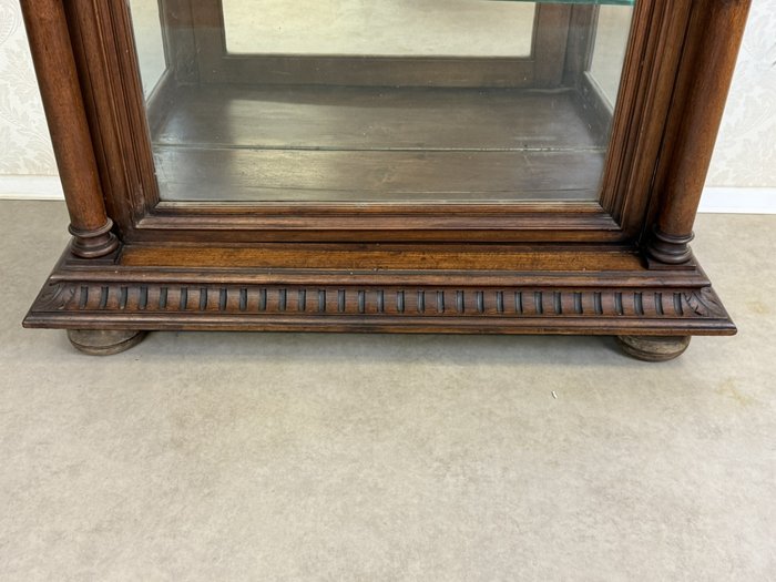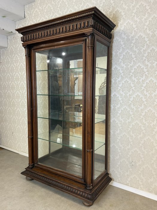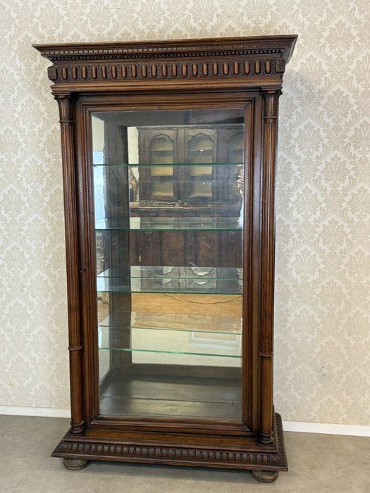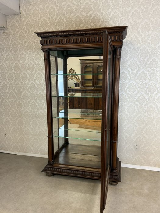 Reprezentativní vitrína ve stylu klasicismu, určená k vystavení porcelánu, skla nebo sběratelských předmětů. Jednokřídlé provedení se skleněnými výplněmi na třech stranách zajišťuje maximální viditelnost vystavených předmětů. Interiér je vybaven skleněnými policemi a zrcadlovým pozadím, které opticky prohlubuje prostor. Vitrína je bohatě zdobená výraznou profilovanou římsou a svislými ozdobnými prvky s drážkováním po stranách. Spodní část doplňují drobné nožky.39 370 Kč
