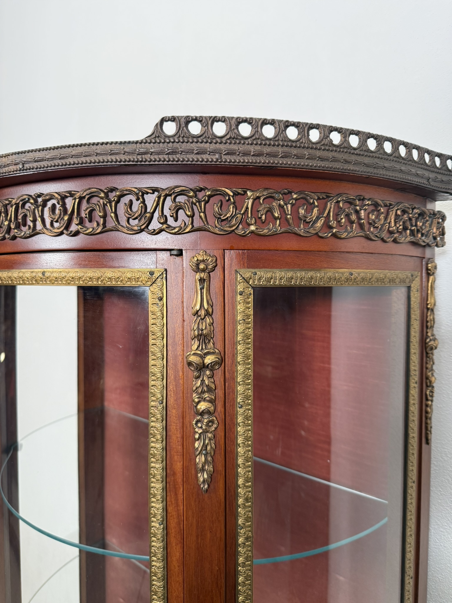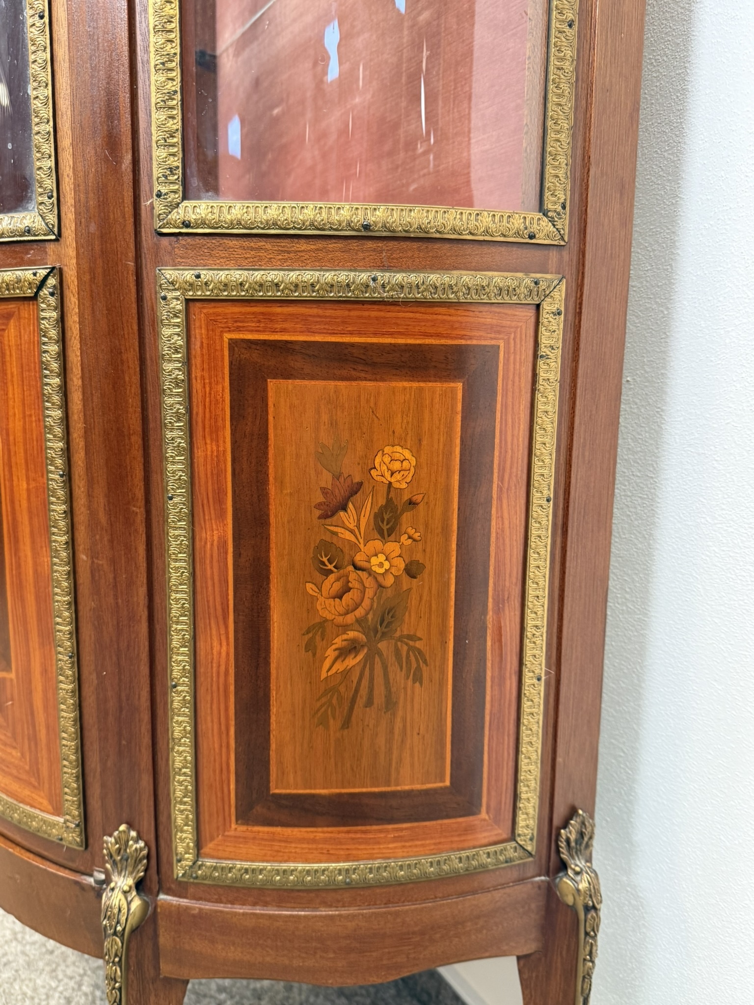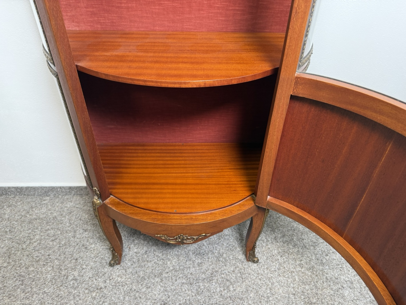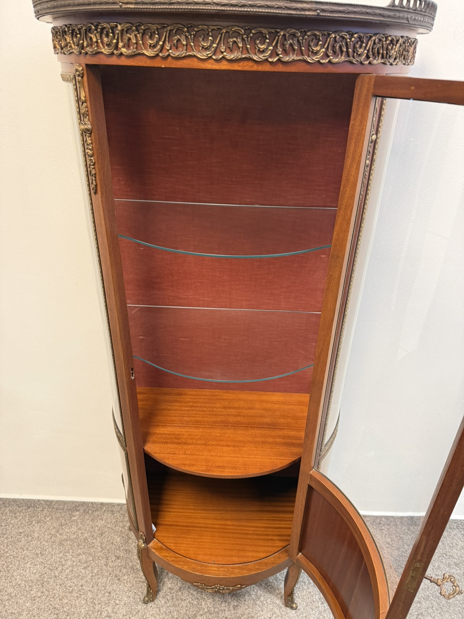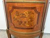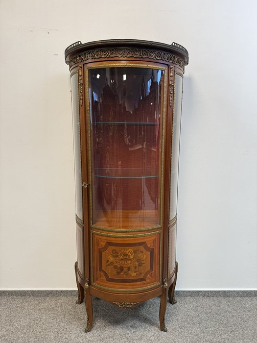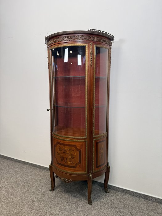 Luxusní prosklená vitrína se zaobleným čelním i bočním sklem, bohatě zdobená květinovou intarzií a bronzovými aplikacemi. Červeně čalouněný interiér se skleněnými policemi.21 250 Kč