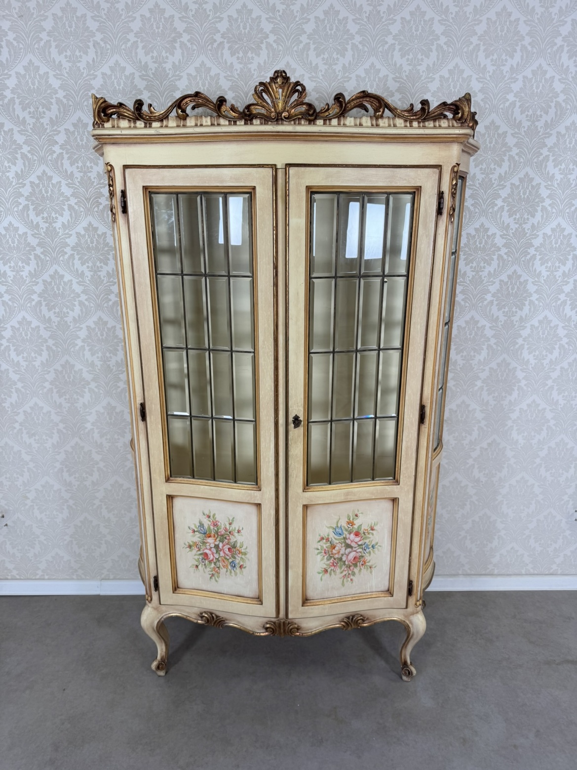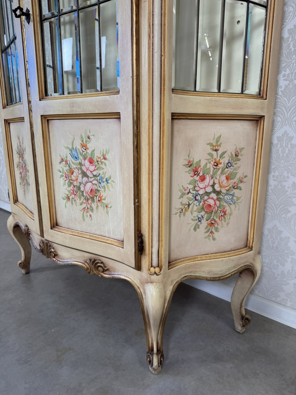 Reprezentativní vitrína s malovanými květinovými motivy na spodních panelech a vyřezávanou římsou. Prosklená dvířka s olovnatým dělením a zaoblené boční stěny poskytují výhled na vystavené předměty. Konstrukce je postavena na křivených nohách s dekorativními řezbami.27 850 Kč