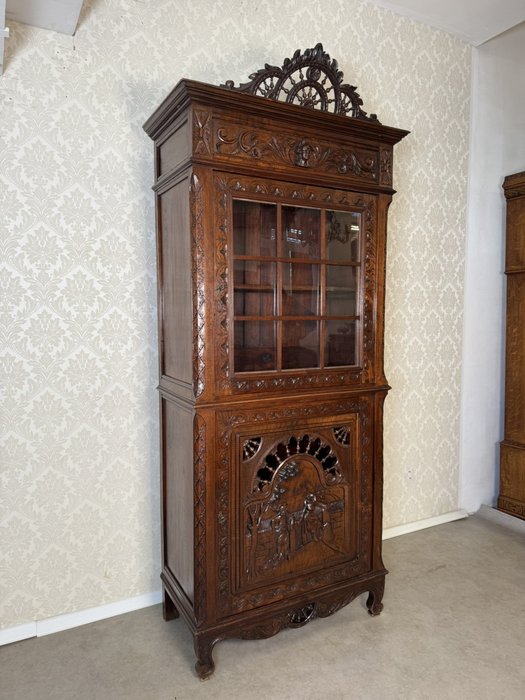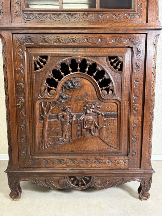 Tato majestátní vitrína představuje skutečné řemeslné mistrovství. Bohatá ruční řezba s rostlinnými a figurálními motivy zdobí celý povrch nábytku. Horní část s prosklenými dvířky, spodní panel upoutá pozornost reliéfní scénou ze života venkovanů. Vrchol vitríny doplňuje dekorativní koruna s ornamentálním průřezem. Tento jedinečný kus vyniká pevnou konstrukcí, hlubokou patinou a neobyčejnou uměleckou hodnotou.30 150 Kč