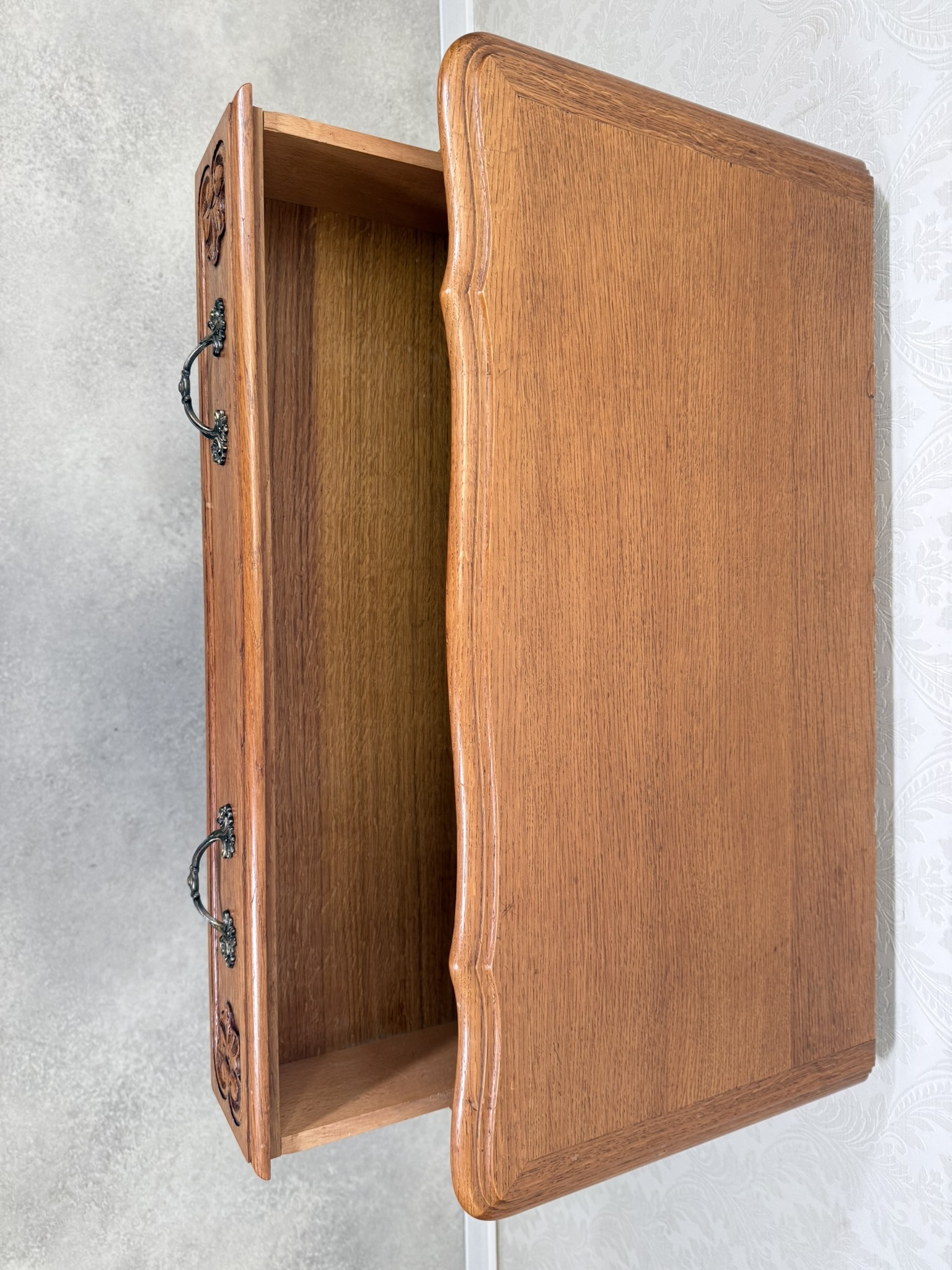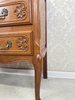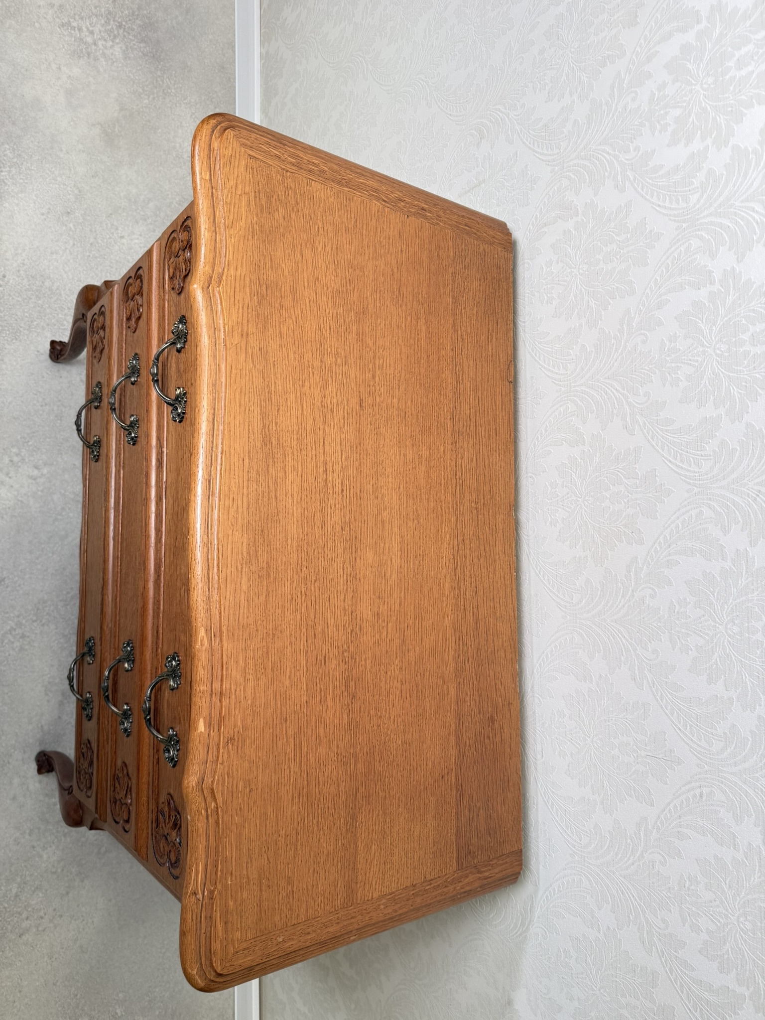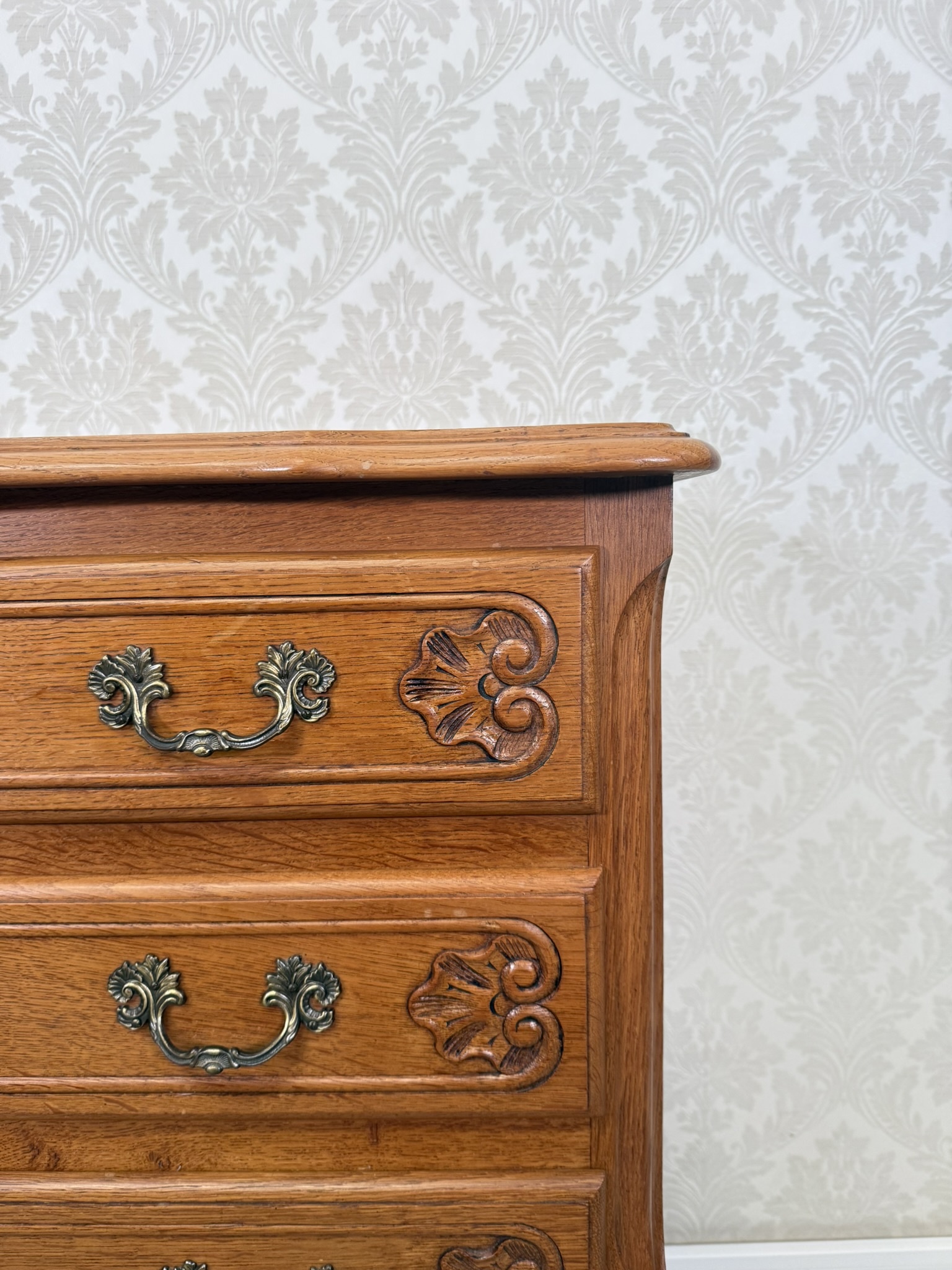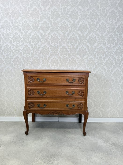 Komoda s ladně prohnutými nohami, jemně tvarovanou horní deskou a bohatě profilovanými zásuvkami. Čelní plochy jsou zdobeny decentní řezbou a mosaznými úchyty s rokokovou ornamentikou.4 860 Kč
