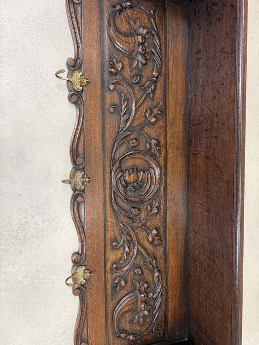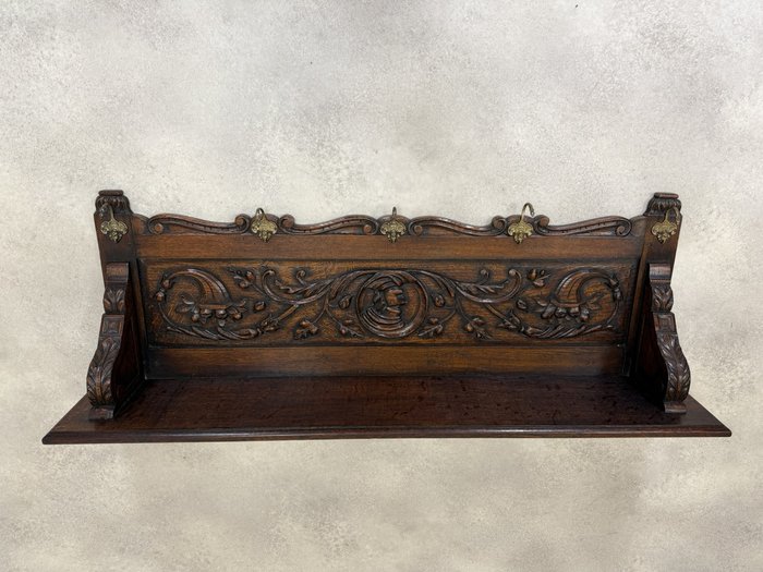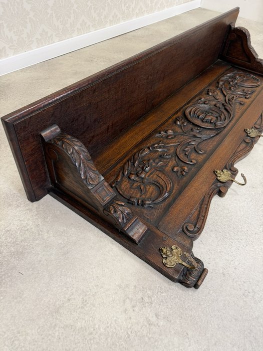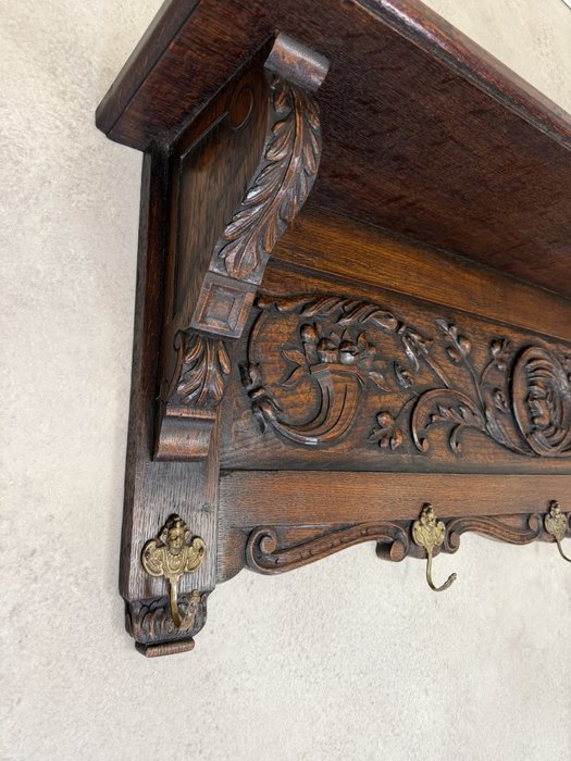 Závěsný věšák je zdobený řezanými florálními motivy a elegantními křivkami. Dominantou jsou čtyři mosazné háčky ve tvaru stylizovaných lvích hlav. Horní část věšáku zdobí vlnovitě tvarovaná římsa.3 850 Kč