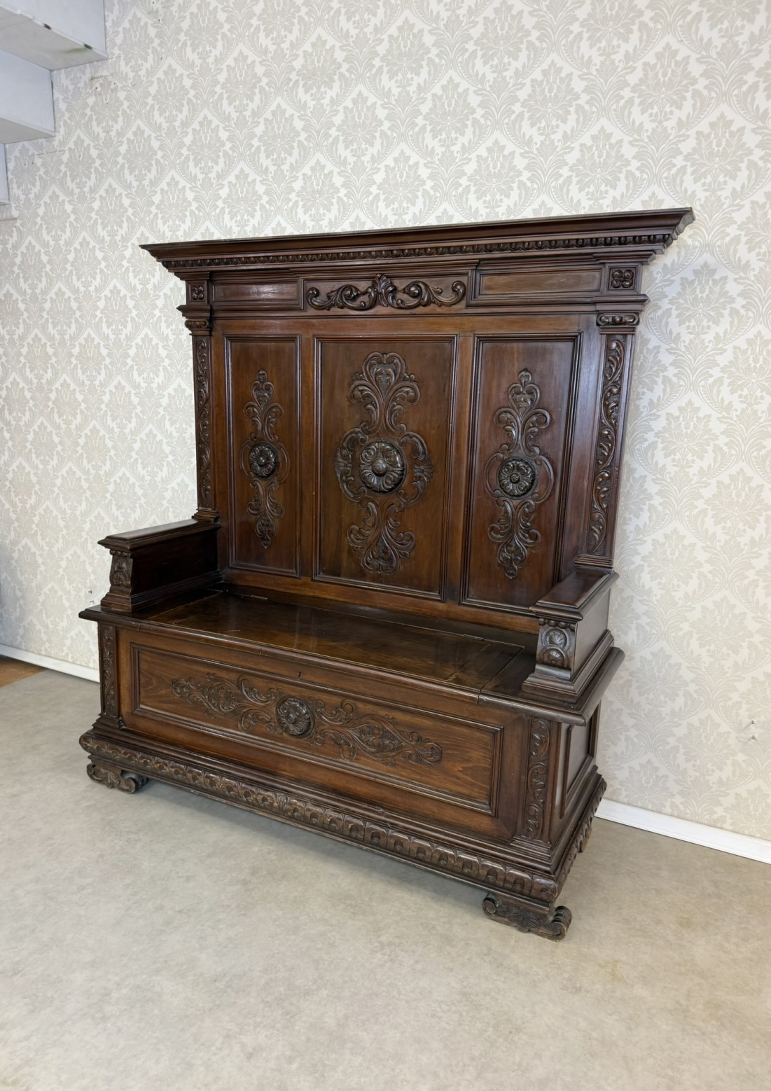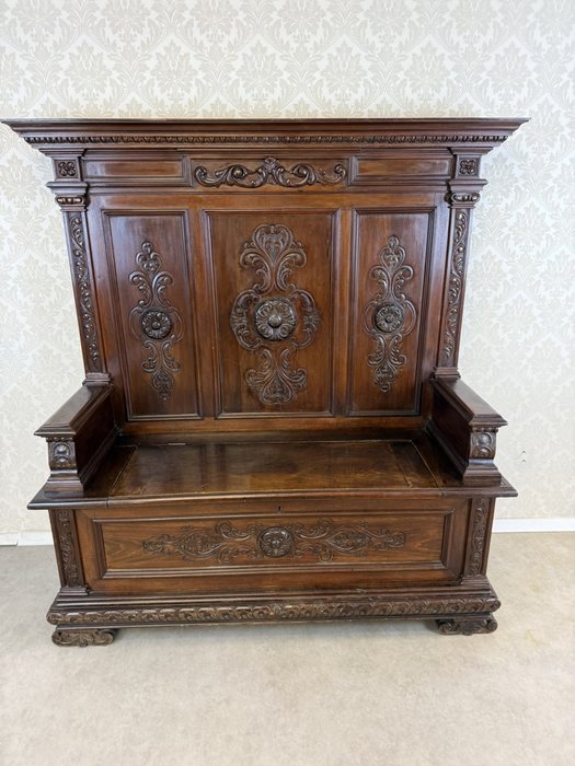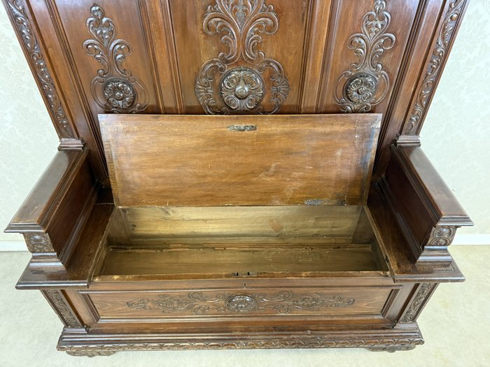 Impozantní lavice s vysokým opěradlem, zdobená bohatou ruční řezbou s florálními a rozvilinovými motivy. Dominantní opěradlo je členěno vertikálními panely s výraznou středovou rozetou a bohatým dekorem. Sedák je výklopný a ukrývá praktický úložný prostor. Opěrky rukou i spodní část lavice jsou zdobeny profilovanými lištami a řezbou. Lavice působí robustně a honosně.26 350 Kč