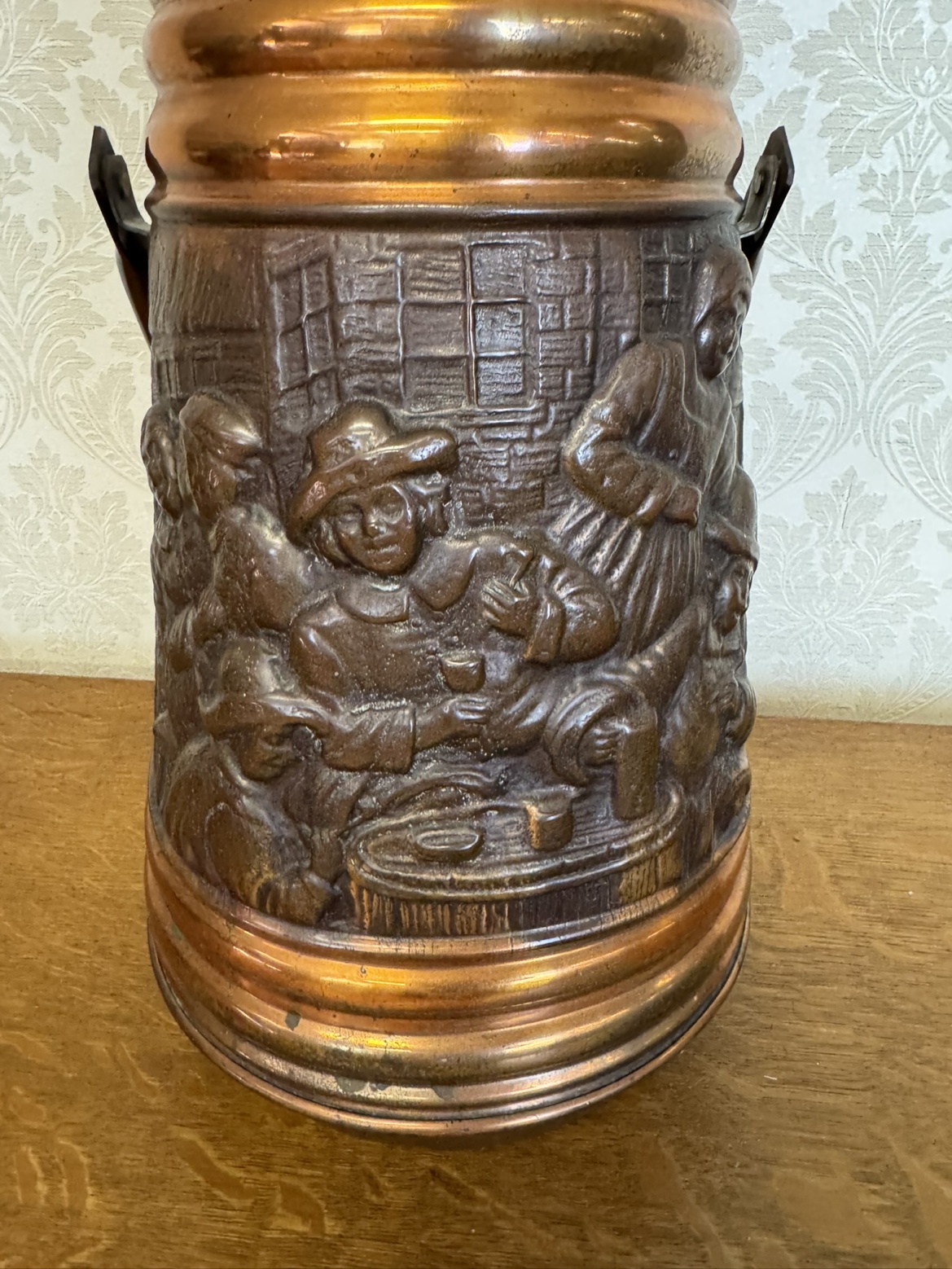Uhlák s detailně zpracovaným reliéfem zobrazujícím postavy v hostinci. Horní část nádoby je tepaná, s mírně zkoseným hrdlem a uchy po stranách.1 580 Kč